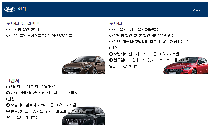 먼저 현대의 재고할인에 대해서 알아보도록 하겠습니다. 눈여겨 볼만한 할인중의 차로는 쏘나타 뉴 라이즈, 쏘나타, 그랜저 등이 있습니다.