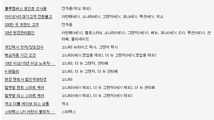 핵심차종 기간조건 : 쏘나타(HEV, 영업용 제외), 더 뉴 그랜저(HEV, 영업용 제외)