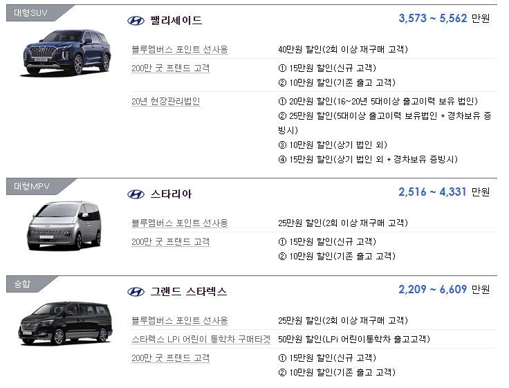 팰리세이드, 스타리아, 그랜드 스타렉스 할인