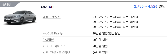 기아 K8에 적용되는 할인, 프로모션의 목록입니다. K8의 경우 2,700만원부터 가격이 형성되어 있습니다.