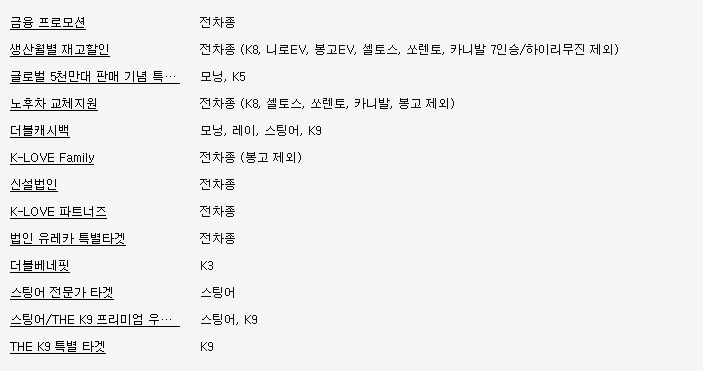 금융 프로모션 : 전차종(레이, 봉고, 셀토스, 쏘렌토, 카니발, 모하비 제외)