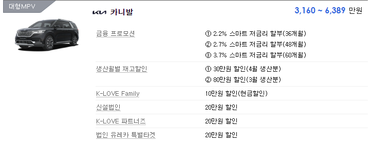 기아 카니발에 적용되는 할인, 프로모션의 목록입니다. 카니발의 가격은 3,100만원부터 형성되어 있는 것을 확인할 수 있습니다.