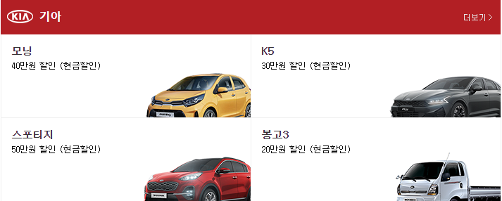 현재 기아자동차의 재고할인은 모닝, K5, 스포티지, 봉고3 등에 대해서 재고할인을 진행하고 있습니다. 각각 차종별로 20만원에서 50만원까지 할인을 진행하는 것을 확인할 수 있는데요, 각각의 차가 어떻게 재고할인을 하고 있는지는 아래에 상세히 쓰도록 하겠습니다.
